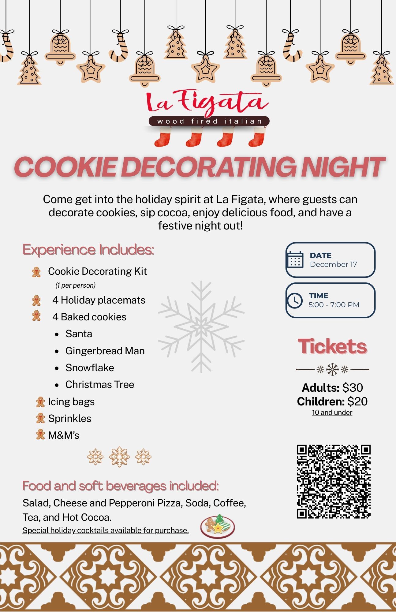 Get into the holiday spirit at La Figata with a festive Cookie Decorating Night on December 17 from 5:00–7:00 PM. Each guest receives their own cookie decorating kit, complete with four baked cookies (Santa, Gingerbread Man, Snowflake, and Christmas Tree), icing bags, sprinkles, and M&M’s. Enjoy a cozy evening with family and friends while decorating cookies, sipping hot cocoa, and enjoying La Figata’s wood-fired Italian favorites. Food and soft beverages are included, with special holiday cocktails available for purchase.